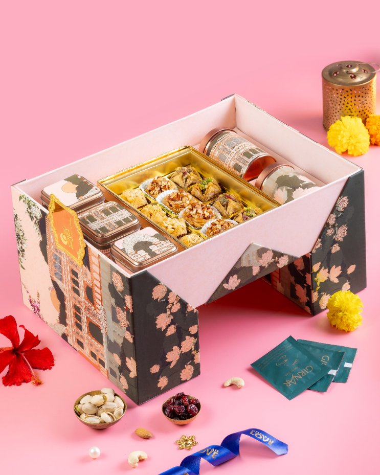 Inside, you’ll find a generous selection of signature sweets and premium dry fruits—each one chosen for freshness, festive flair, and rich flavor.