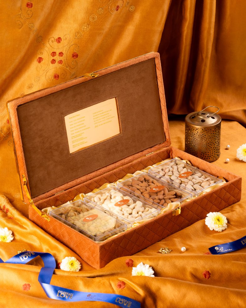 Velvet Golden Vault is designed for those who want to make a statement with their festive gifting in Gandhinagar. This exclusive gift box features a premium selection of dry fruits, including 160 grams of cashews and 160 grams of almonds—each carefully chosen for exceptional taste, crunch, and freshness.